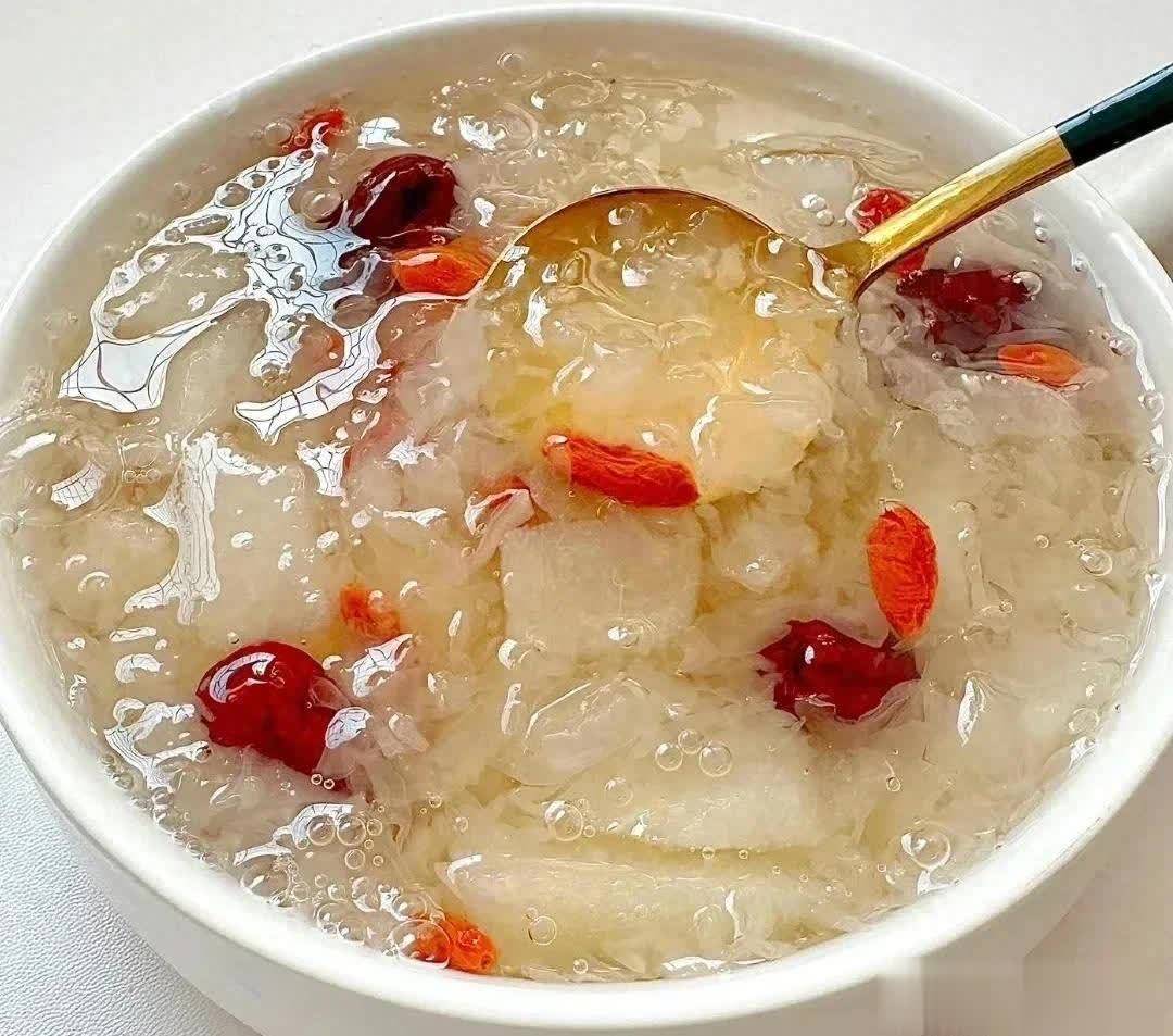 4.放入雪梨丁和枸杞,再煮3分钟,雪梨变软就关火。晾到温温的,孩子用勺子挖着吃,银耳的胶混着小米的稠,极端空隙。